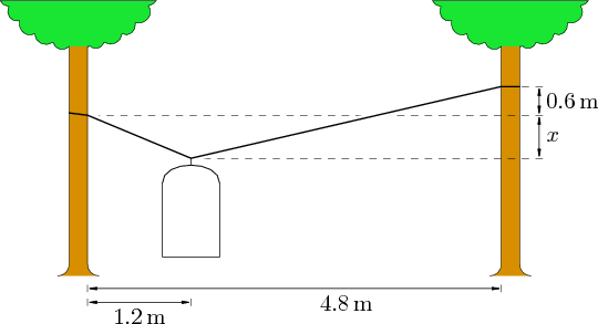 A washing line of length 5.4 m hangs between two vertical trees that are at a distance of 4.8 m from each other. One end of the line is fixed 0.6 m higher than the other, and a jacket hangs from a hanger 1.2 m from the tree where the line has its lower point of attachment. Determine how far below the lower attachement point the hanger is hanging. (That is, the distance \displaystyle \,x\, in the figure).